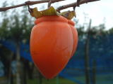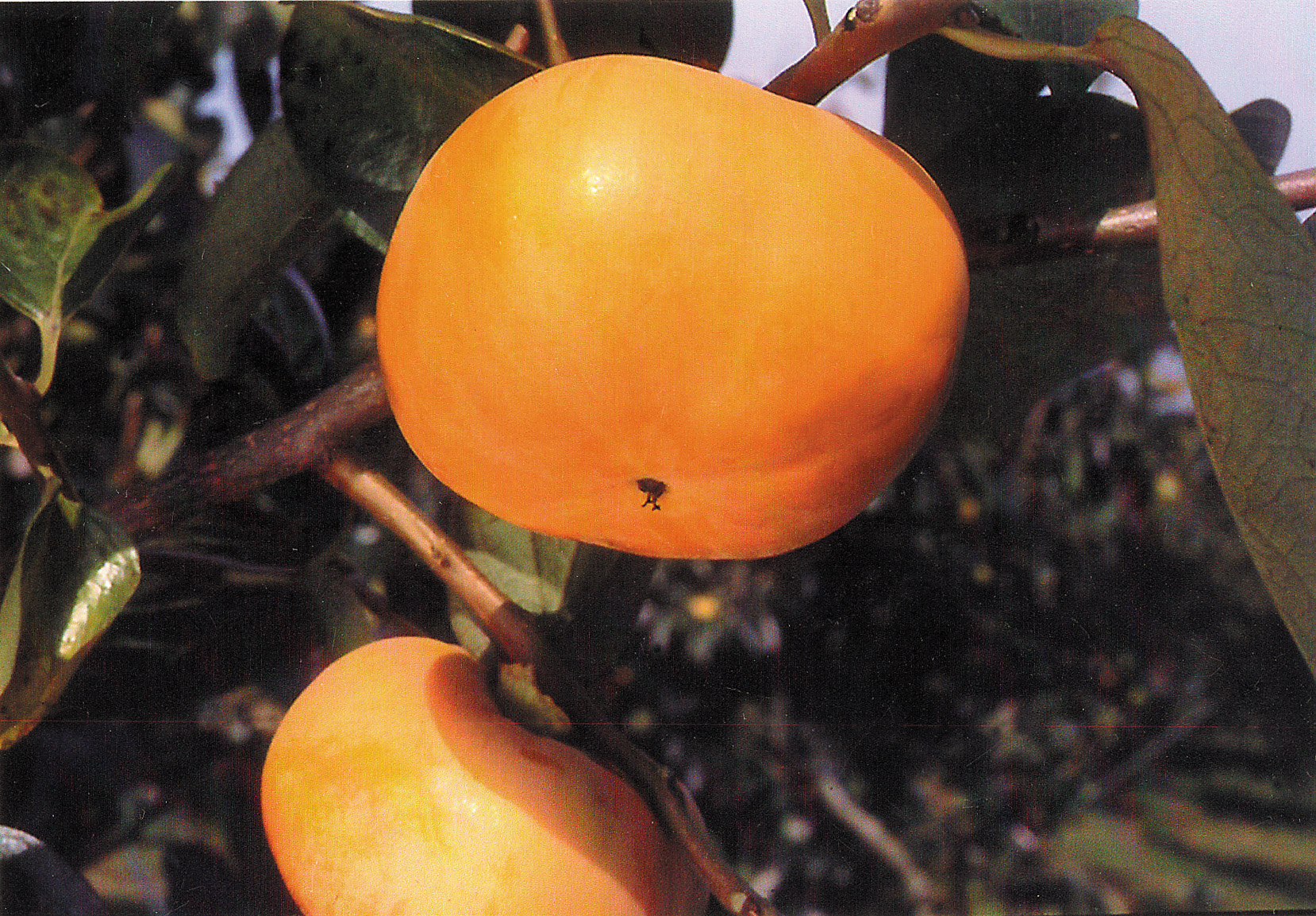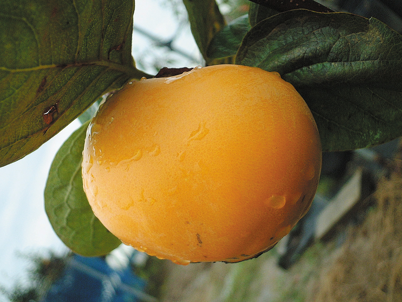 | 本種は、「富有」の枝代わりであり、450gと極大果で、果形は扁円形、果肉は緻密でゴマが少なく、食味良好。生理的落果も少なく、豊産性の品種である。受粉樹の混植が必要である。 |