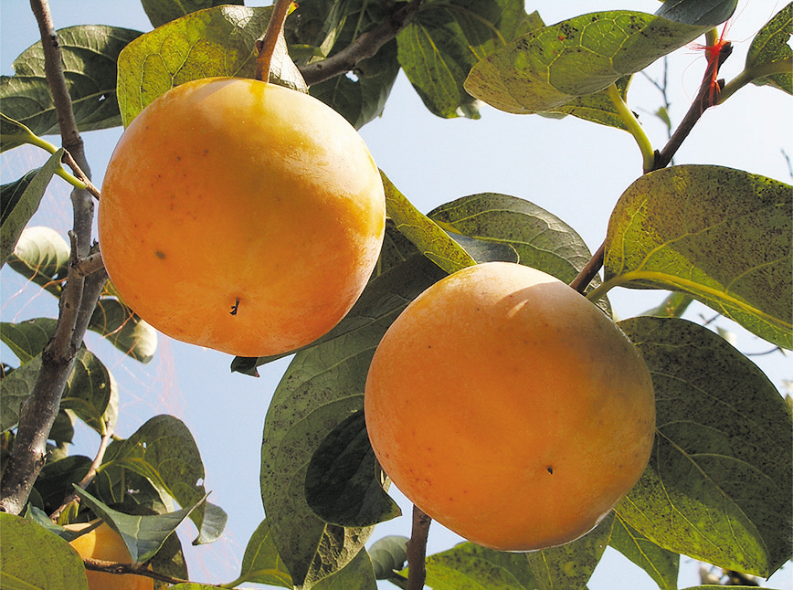 | 果形は扁平、果肉は、ち密で軟らかく、果汁も多い。糖度16%位もあり、甘味も良好である。 おけさ柿・庄内柿としても有名な品種であり、干し柿にも適しています。 |